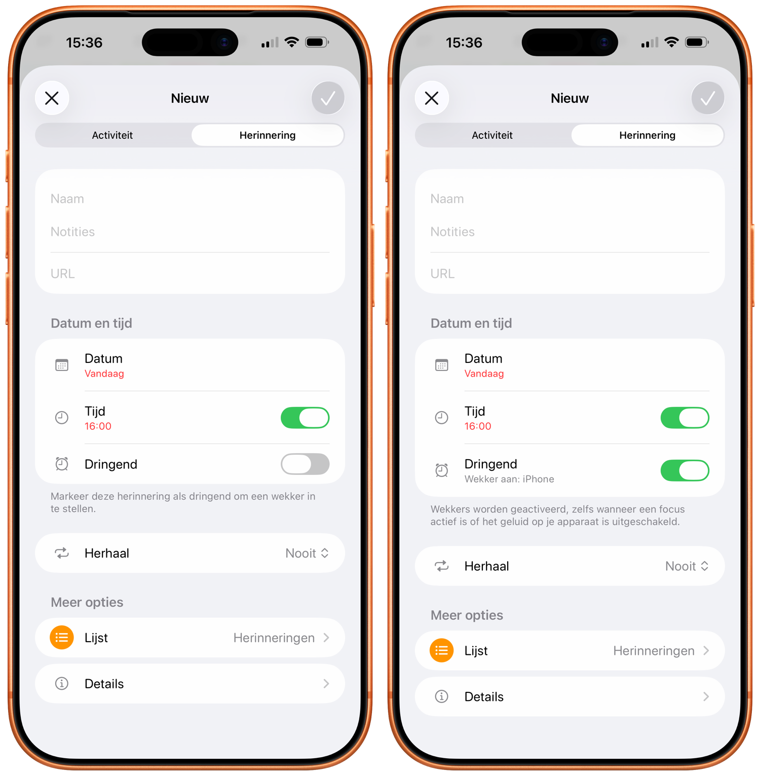 - Zet de schakelaars bij zowel Tijd als Dringend aan. Selecteer een tijd en op dat moment zal je wekker afgaan.