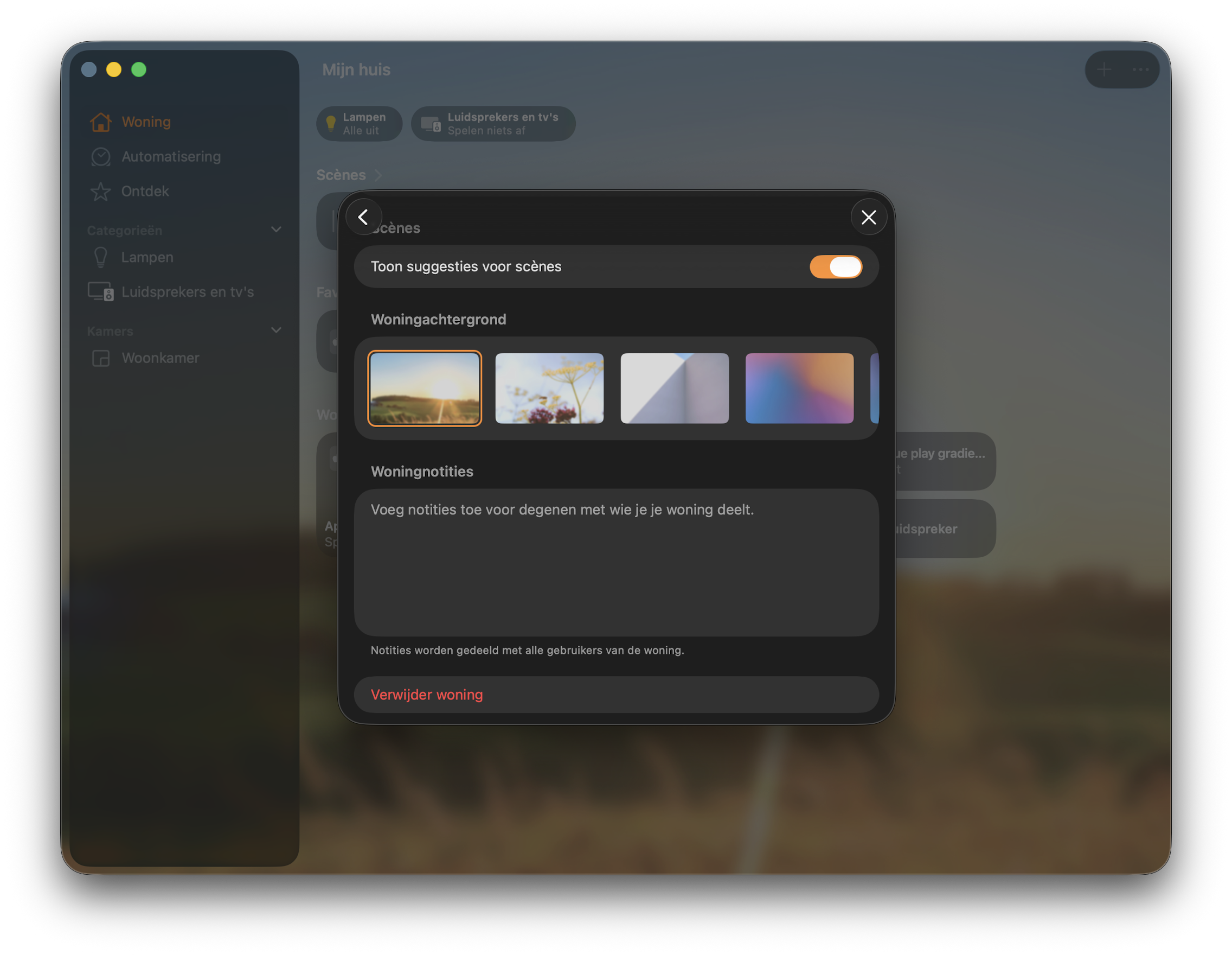 Standaard worden de gebruikte achtergronden van de Woning-app gesynchroniseerd met de iOS-versie. Je kan op de Mac ook zelf een nieuwe achtergrond instellen.