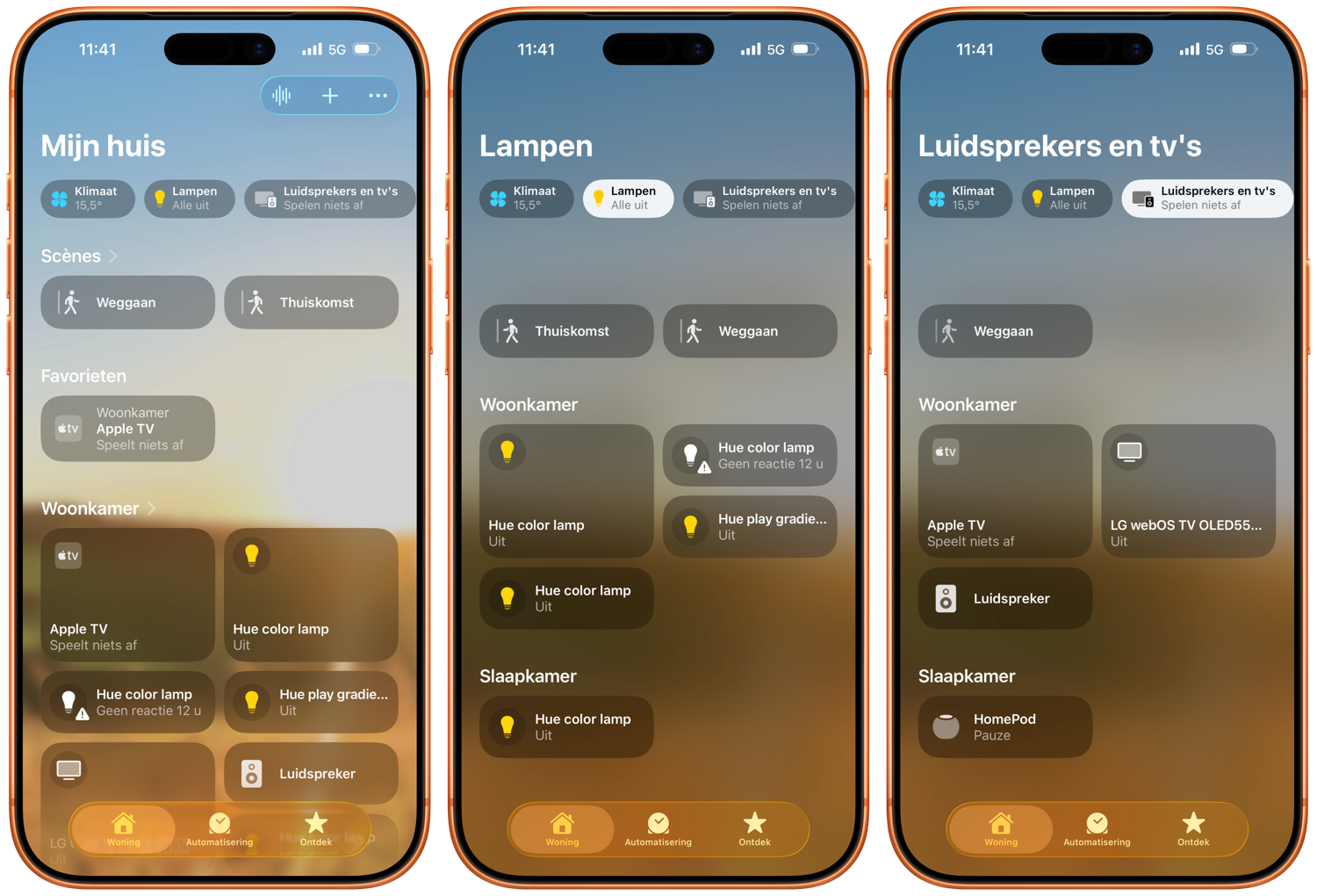 Het is niet mogelijk om zelf categorieën aan te maken en accessoires in te delen, want dat gaat geheel automatisch. Op het Woning-tabblad zie je onder de categorie een korte samenvatting van alle accessoires binnen die categorie. Je ziet bijvoorbeeld een gemiddelde temperatuur van alle sensoren, hoeveel lampen er aan staan of op welke speaker er iets wordt afgespeeld. Je kunt per accessoire bepalen of deze meegenomen moet worden in de bijbehorende categorie en of de status van het HomeKit-accessoire getoond moet worden op het Woning-tabblad.