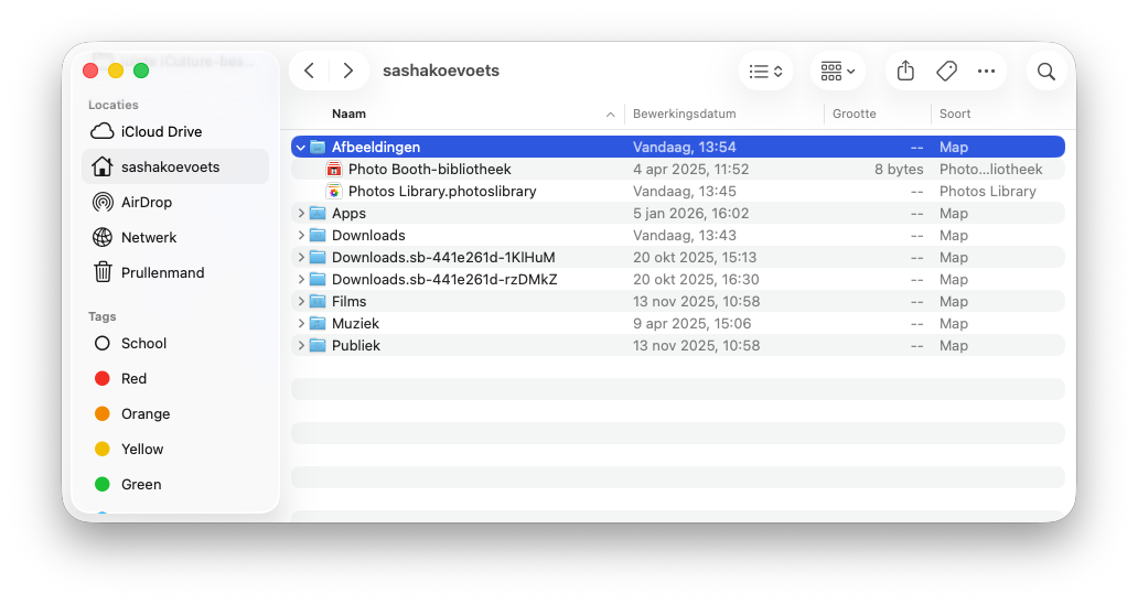 - Ga naar de map ‘Afbeeldingen’ in de thuismap op je Mac. Hier vind je het bestand ‘Photos Library.photoslibrary’ waarin alle foto’s zijn opgeslagen.