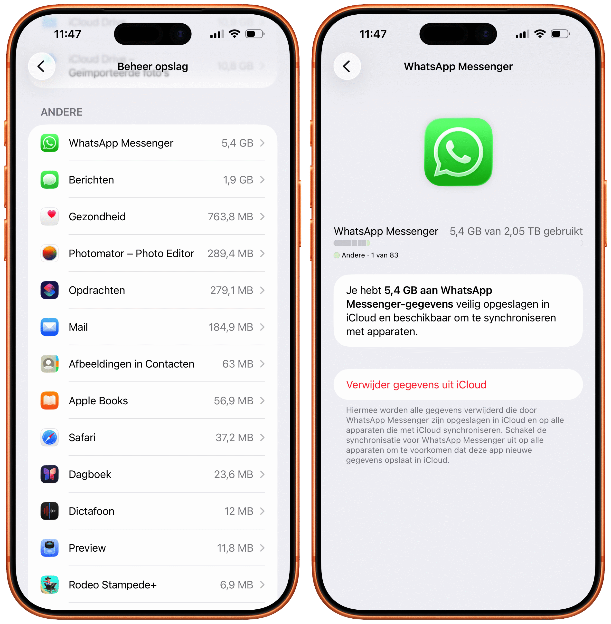 Wist je dat WhatsApp op twee manieren een backup kan maken: als onderdeel van je algehele iCloud-backup én een eigen backup die apart in iCloud opgeslagen wordt. Standaard staan beide opties aan, maar dat is eigenlijk niet nodig. Je WhatsApp gegevens worden daardoor dubbel bewaard, wat tot meerdere extra GB’s aan ruimte kan innemen. Wij adviseren om bij ruimtetekort WhatsApp als onderdeel van je algehele iCloud-backup uit te schakelen. Controleer dan ook wel of de eigen backup van WhatsApp ingeschakeld is: