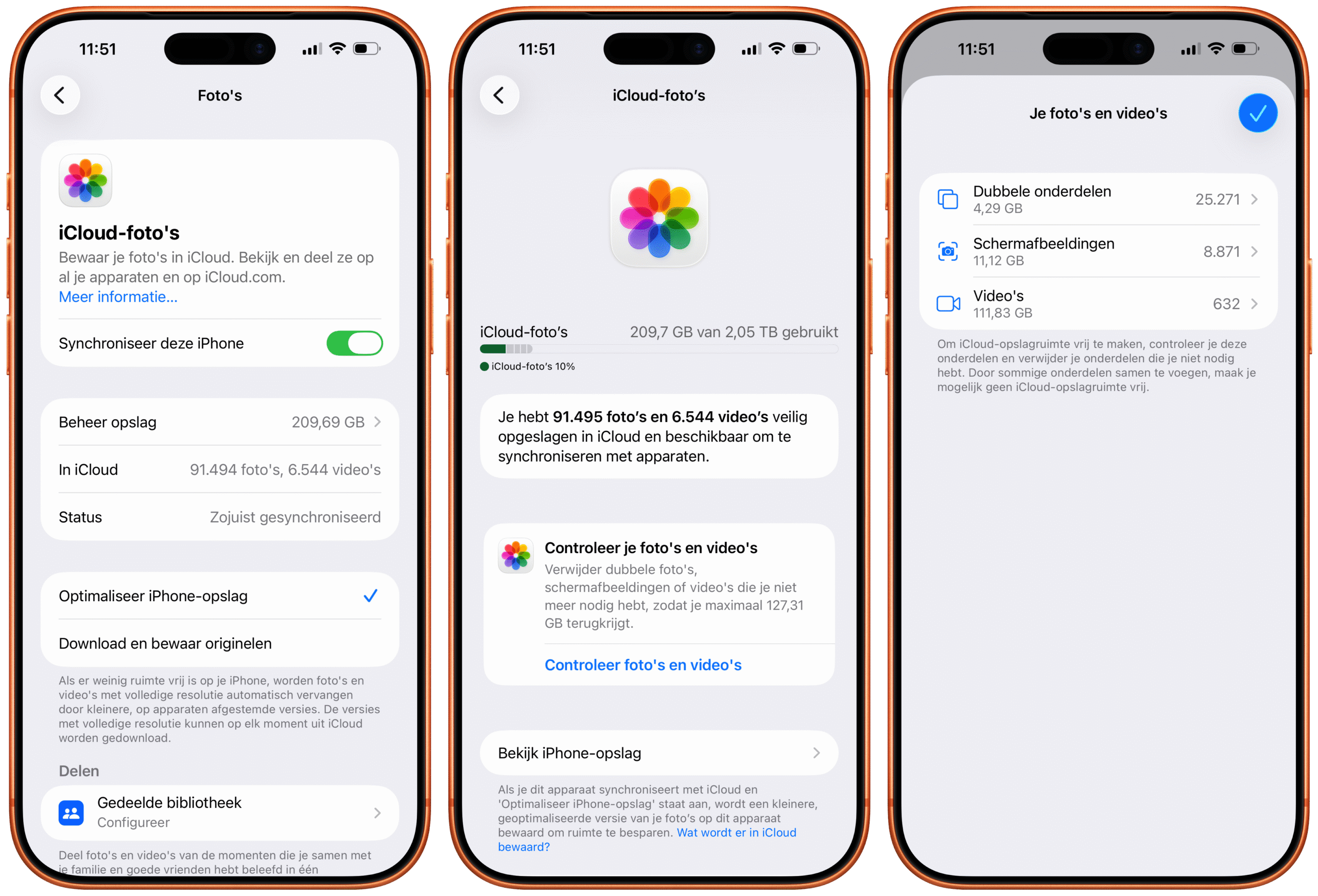 Als je gebruikmaakt van iCloud-fotobibliotheek, merk je dat deze veel ruimte inneemt in je iCloud-opslag. Als je je iCloud opslag wil opruimen, is dit dus een goede plek om te kijken. Je kunt dit opruimen door individuele foto’s en video’s van je iPhone of iPad te verwijderen. Ze verdwijnen dan uit iCloud en van al je apparaten. Wil je foto’s wel bewaren, maar niet in iCloud? Dan kun je ze lokaal opslaan (bijvoorbeeld op een Mac of pc). Je kan ze ook in een andere opslagdienst voor foto’s opslaan. De snelste manier is om video’s te verwijderen, omdat deze meer ruimte innemen.