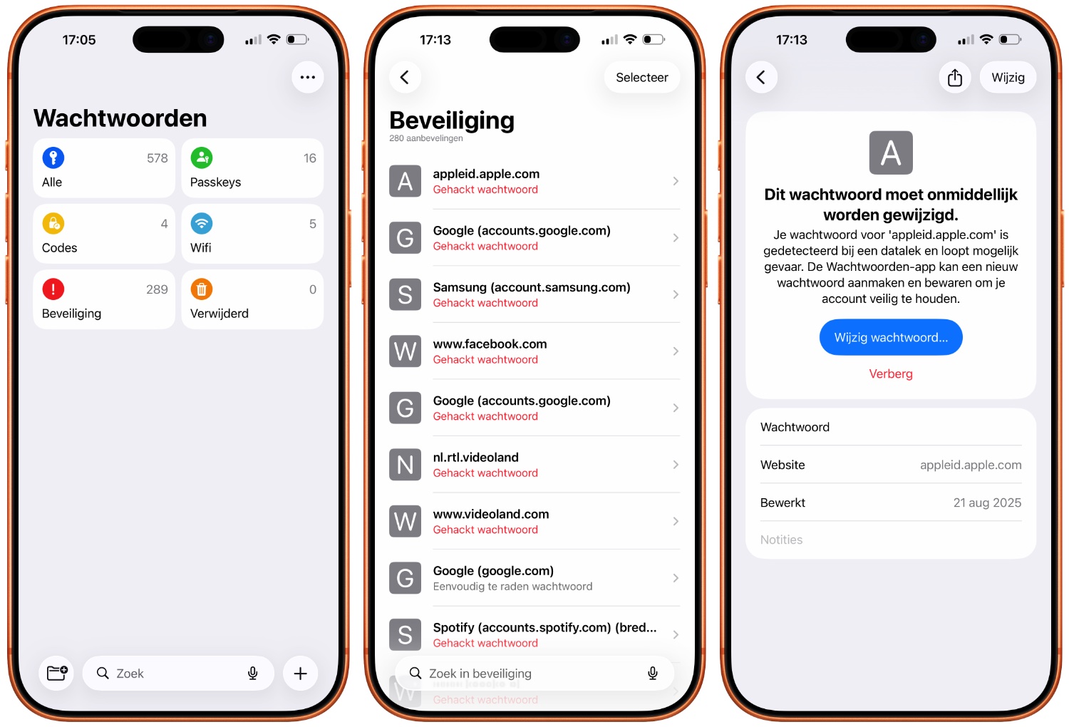 Je krijgt met de Wachtwoorden-app een waarschuwing bij een gelekt wachtwoord. De iPhone waarschuwt als je een wachtwoord gebruikt dat gemakkelijk te raden is, of als het wachtwoord betrokken is geweest bij een datalek. Tik hiervoor op het blokje Beveiliging in de Wachtwoorden-app. Er staat per melding ook wat er aan de hand is met je account. Dit kan betekenen dat je wachtwoord gehackt is, maar ook dat deze betrokken is bij een datalek.