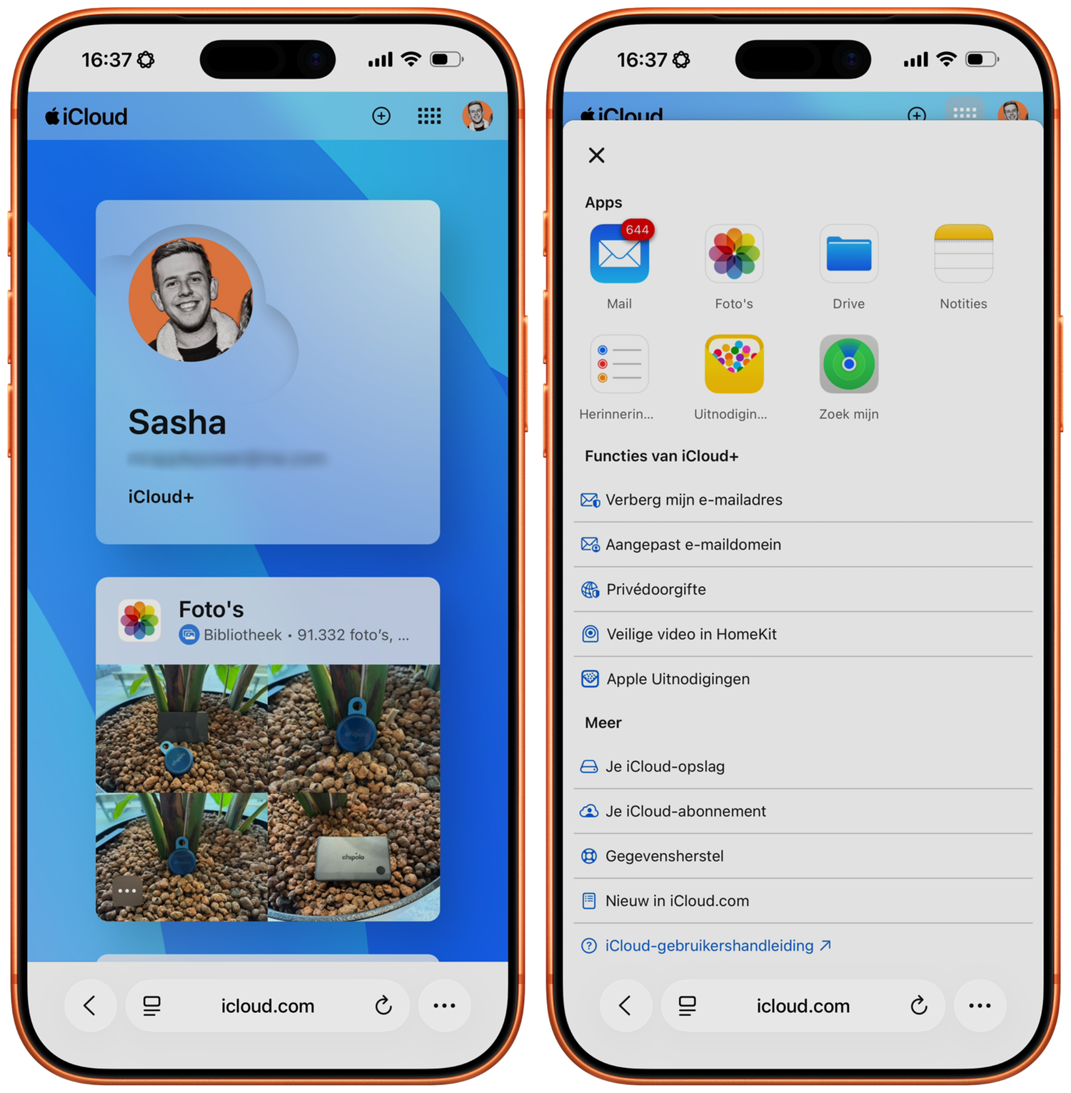 Tot slot biedt Apple bij nog een aantal handige opties onderaan de pagina. Je vindt deze optie door rechtsboven op de knop met de vierkantjes te klikken. Je vindt hier een snelkoppeling naar individuele iCloud+ functies (indien geabonneerd), je iCloud-opslag, het type abonnement en de functie voor gegevensherstel. Als je iets per ongeluk verwijderd hebt, kun je het hier terughalen. Denk aan contacten, bladwijzers en agenda-afspraken. Bij Instellingen kun je met een druk op de knop kun je eveneens uitloggen in alle browsers waarin je via iCloud.com ingelogd bent. Dit is een extra veiligheidsmaatregel als je bijvoorbeeld op een openbare computer ingelogd bent.