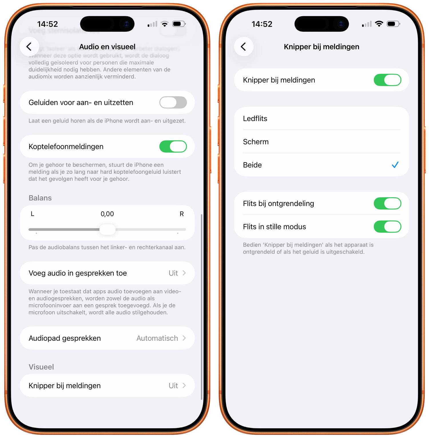 Met iOS 26.2 komt er een nieuwe optie bij in het menu, waardoor je naast de LED-verlichting aan de achterkant ook het scherm van je iPhone kan laten flitsen. Dat stel je zo in: