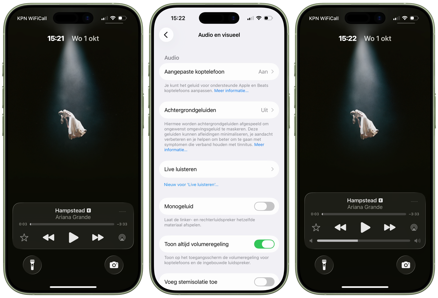 Bij het afspelen van muziek of andere audio op de iPhone, verschijnt automatisch de mediaspeler op het toegangsscherm. Dat is al zo sinds het prille begin van de iPhone. Je ziet hier de afspeelknop en knoppen om naar het volgende of vorige nummer te gaan. In de mediaspeler staat eveneens een tijdsbalk, waarmee je vooruit of achteruit kan spoelen. Tot een paar jaar geleden vond je in de mediaspeler op het toegangsscherm ook een volumeregelaar, maar Apple besloot deze te verwijderen. Je kan deze – met een kleine omweg – weer terugbrengen op het iPhone-toegangsscherm.