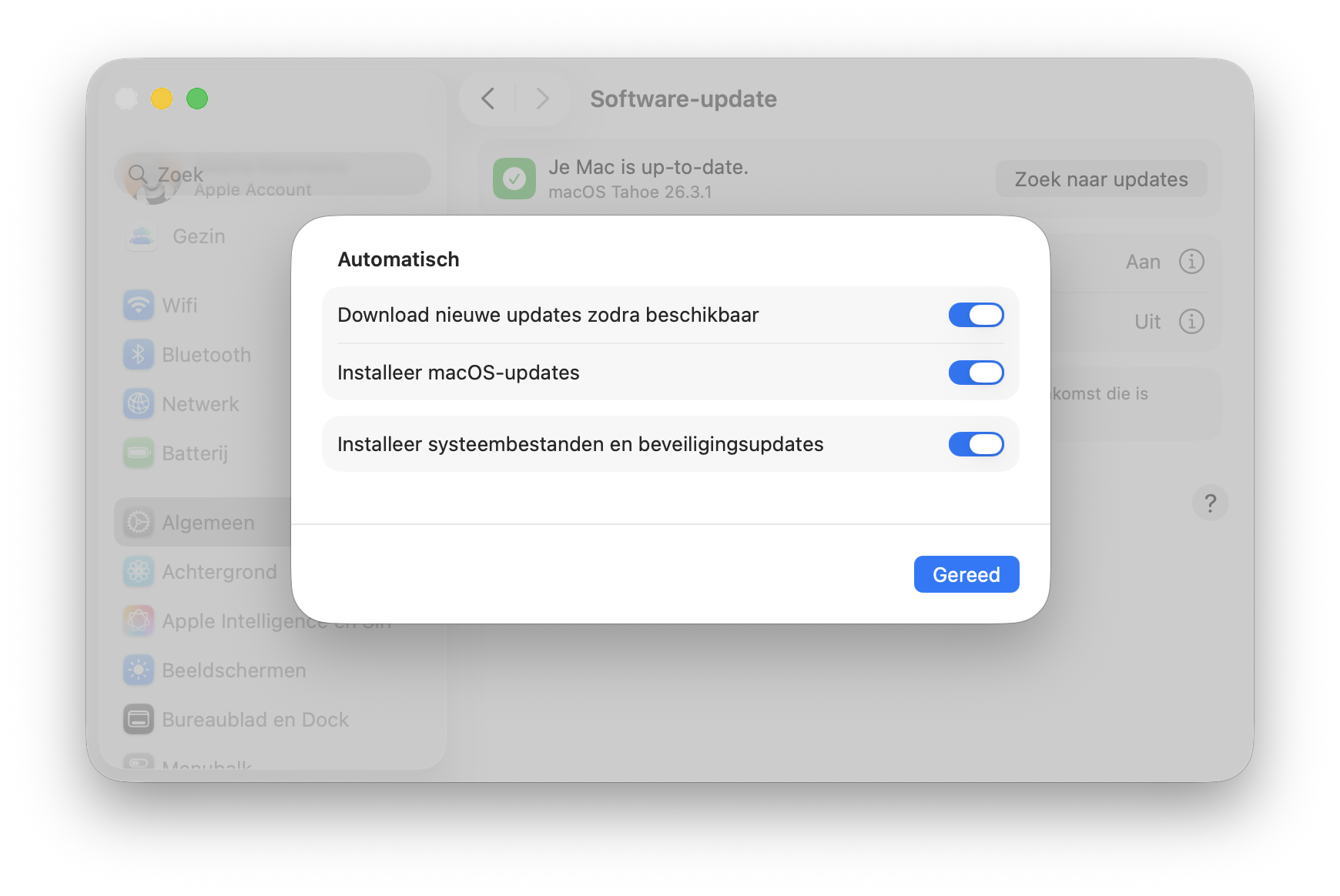 Wil je dat updates automatisch worden geïnstalleerd zodra ze beschikbaar komen, zodat je er geen omkijken naar hebt? Dat kan. Open Systeeminstellingen > Algemeen > Software-updates. Achter het item Automatische updates klik je op de (i)-knop.