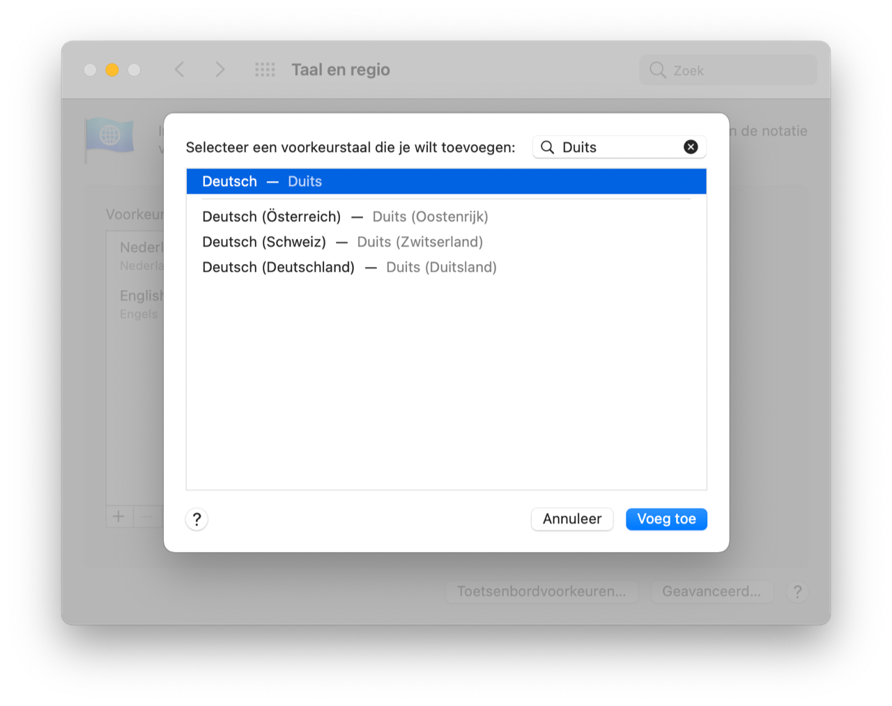 - Tik op Voeg taal toe en zoek de taal.