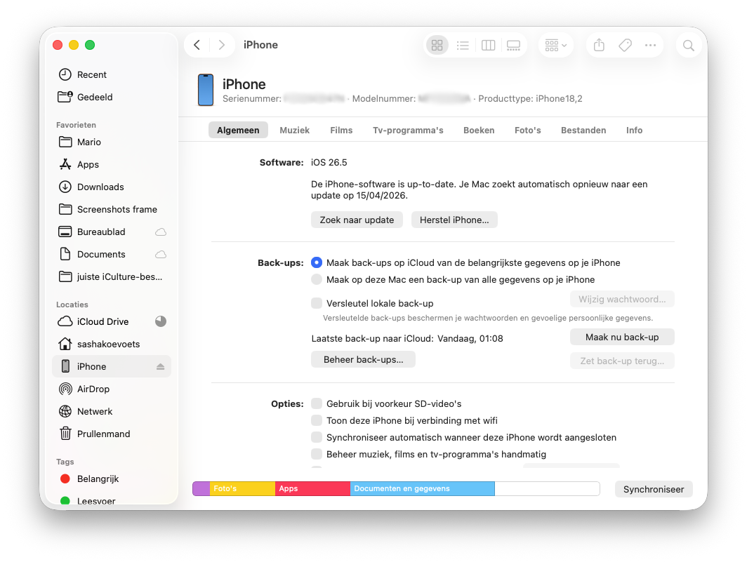 - Via Finder: Sluit de iPhone aan op de Mac en open Finder. Klik in de zijbalk op jouw toestel en klik op de modelnaam (links van het batterij-symbool). Is het serienummer niet zichtbaar maar staat er een andere waarde, zoals UDID, ECID of modelaanduiding? Klik dan met de muispijl een paar keer hierop, totdat je het juiste nummer te zien krijgt.