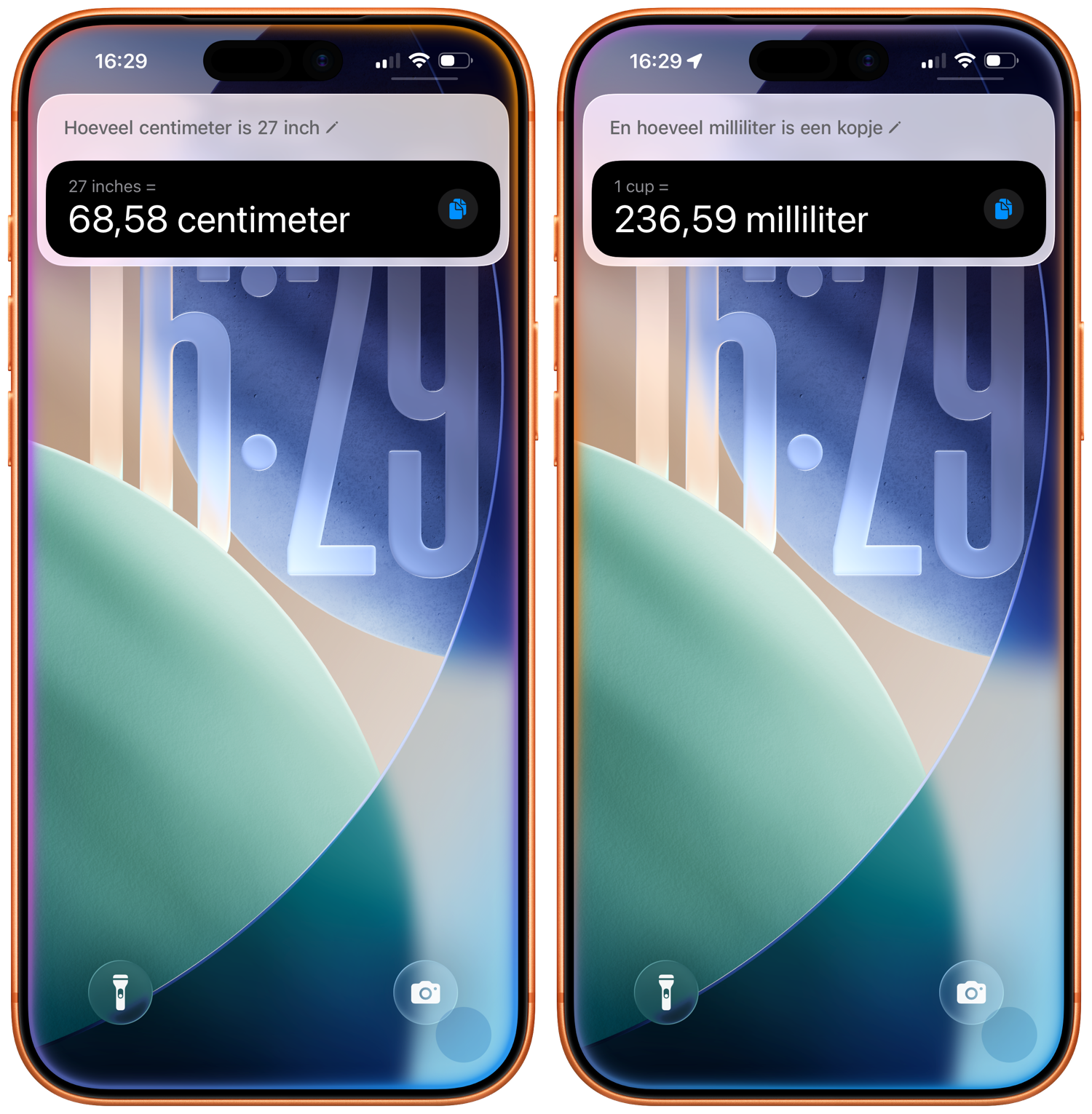 Tot slot kan je ook eenvoudig eenheden omrekenen met Siri. Denk dan aan kilo’s naar gram, maar ook ingewikkeldere omrekeningen zoals van . Ook buitenlandse eenheden kent Siri, bijvoorbeeld van inches naar centimeter. Handig als je bijvoorbeeld wil weten hoeveel centimeter een 24-inch iMac nou eigenlijk is. Het omrekenen van eenheden komt ook goed van pas in de keuken. Je kan bijvoorbeeld vragen hoeveel milliliter één kopje is.