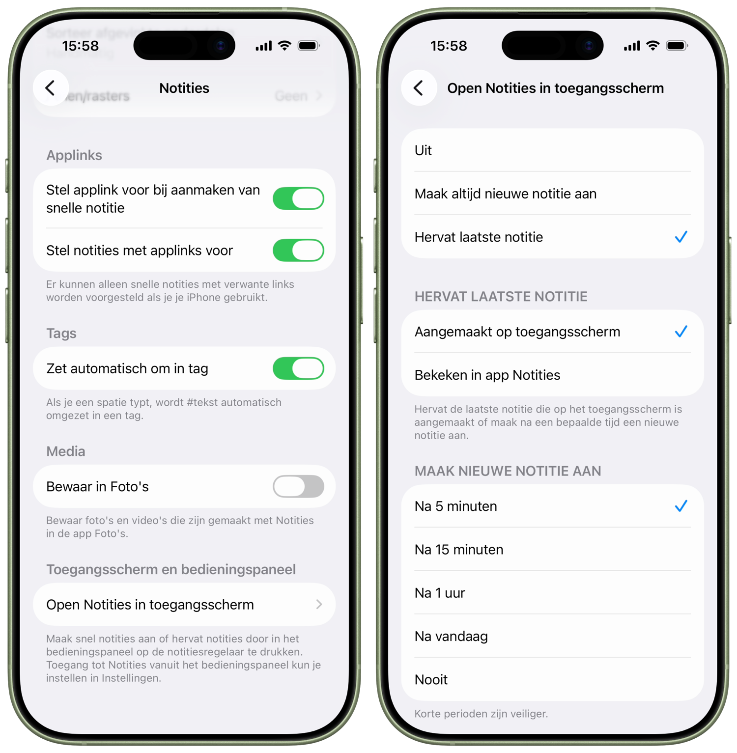 - Kies je voor Hervat laatste notitie, dan heb je meer opties. Hij opent dan de laatste notitie die vanaf het toegangsscherm is aangemaakt óf de aantekening die je als laatste in de Notities-app bekeken hebt.