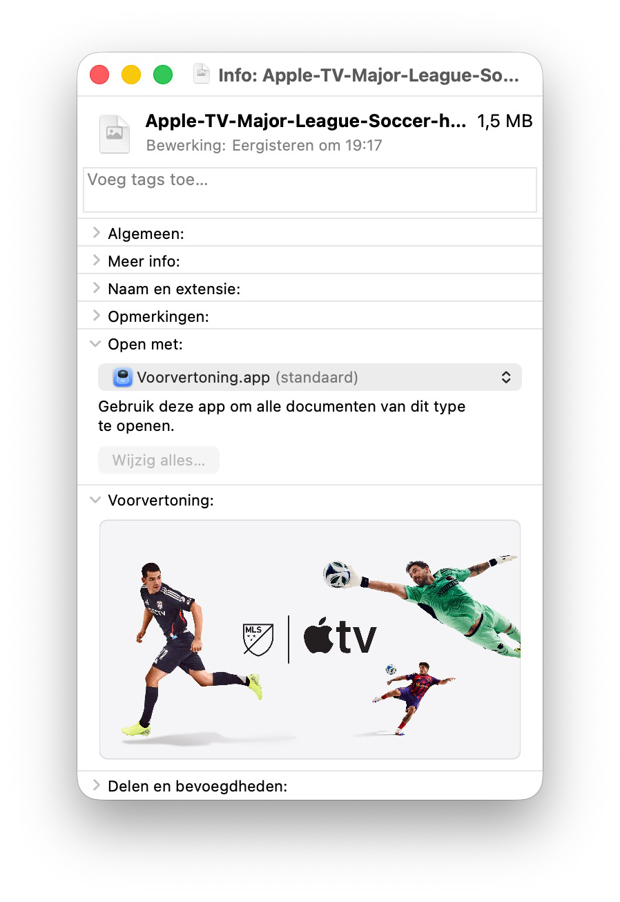 - Nu opent het infovenster van dit bestand. Hierin staan alle metadata, waaronder ook de optie die bepaalt met welk programma dit bestand standaard wordt geopend.