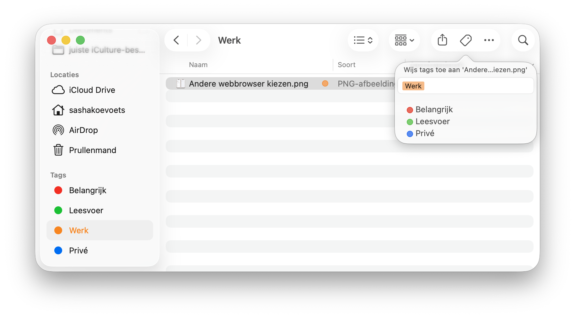 Je kunt ieder bestand en iedere map in macOS een tag geven. Met dit label maak je het bestand gemakkelijk vindbaar op je Mac. Om een bestand uit te rusten met de juiste tag, tik je rechtsboven op het label-icoontje. Selecteer vervolgens de juiste tag (of meerdere tags).