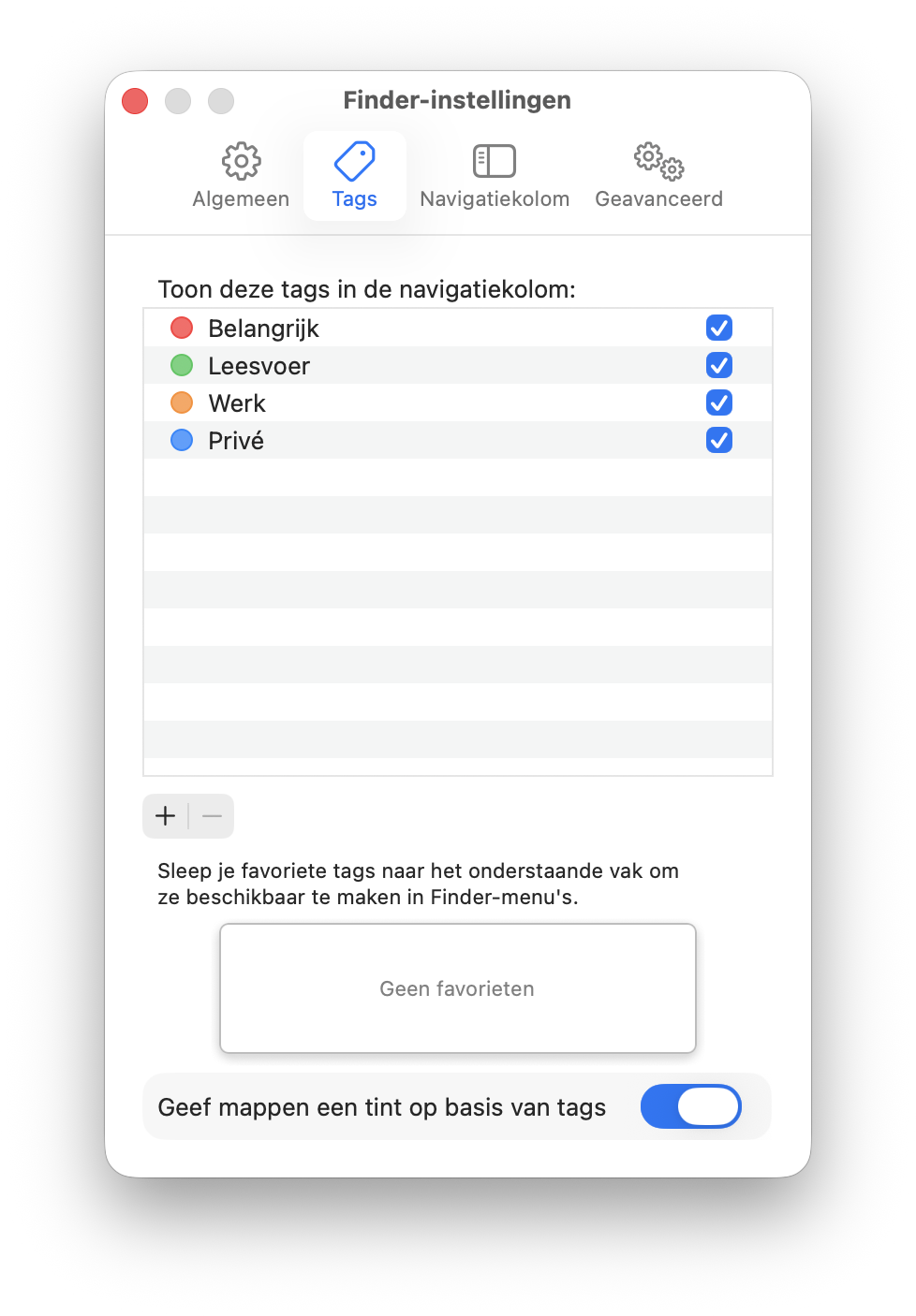 Tags zijn digitale labels die het makkelijk maken om specifieke bestanden te vinden op je Mac. Je kunt zoveel tags aan een bestand of map toevoegen als je wilt. De tags worden gesynchroniseerd via iCloud, zodat je ook op andere Macs de juiste bestanden kunt terugvinden. Tags zijn op de iPhone en iPad terug te vinden in de Bestanden-app.