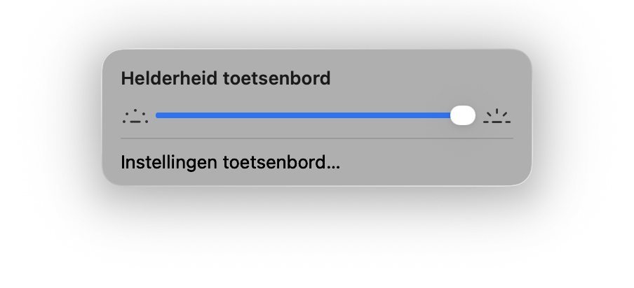 De makkelijkste manier is om via de menubalk de toetsenbordverlichting aan te passen. Klik op het icoontje voor het Bedieningspaneel, te herkennen aan een afbeelding van twee schuifjes. Klik nu op het icoontje voor de toetsenbordverlichting, die eruit ziet als een opkomende zon. Je kun nu de schuifknop heen en weer bewegen om verlichting aan te passen.