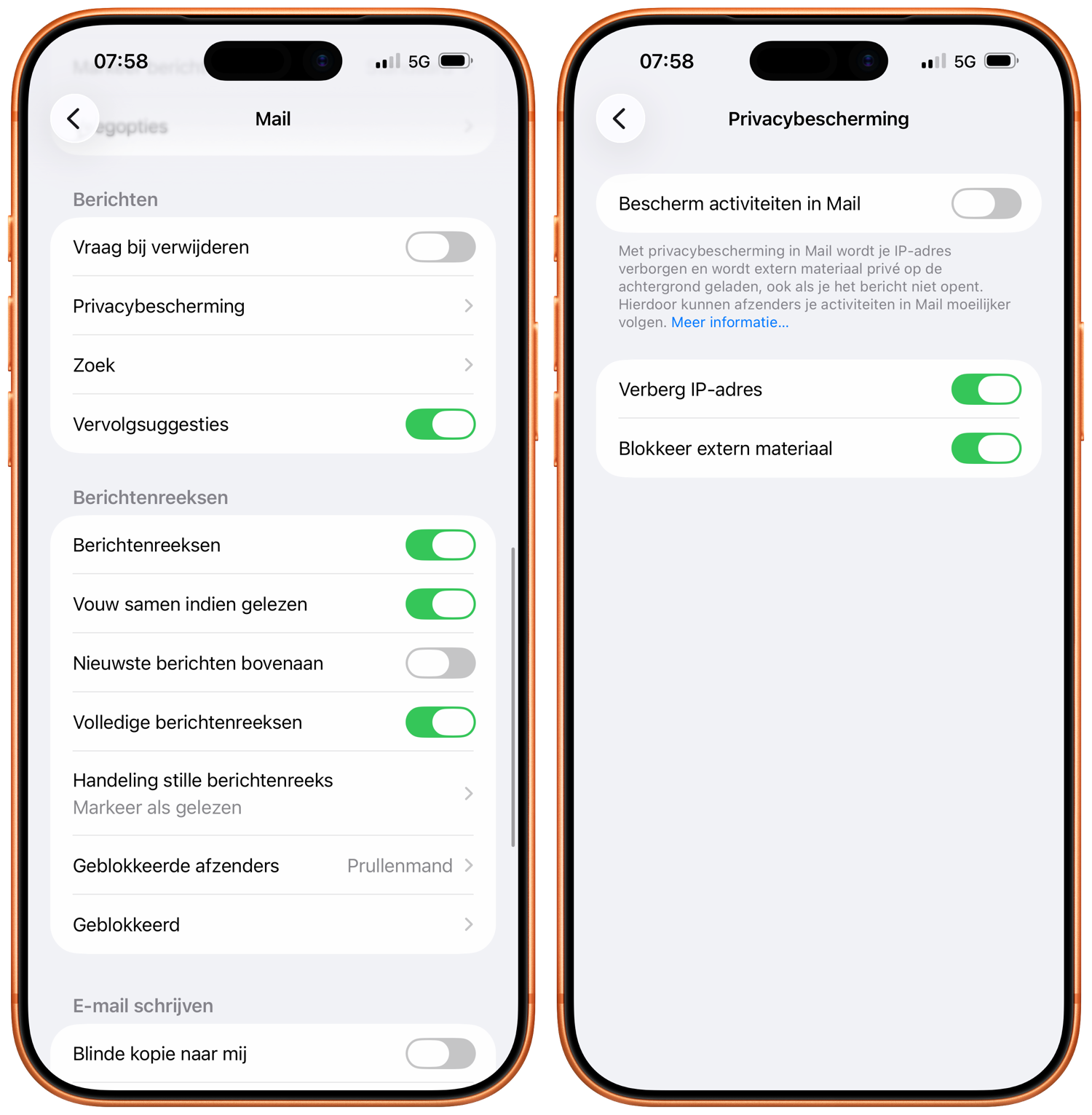 Op de iPhone en iPad kun je ook kiezen voor de optie voor Privacybescherming in Mail. Heb je dit uit of gebruik je een oudere iOS-versie, dan kan je deze instellingen gebruiken: