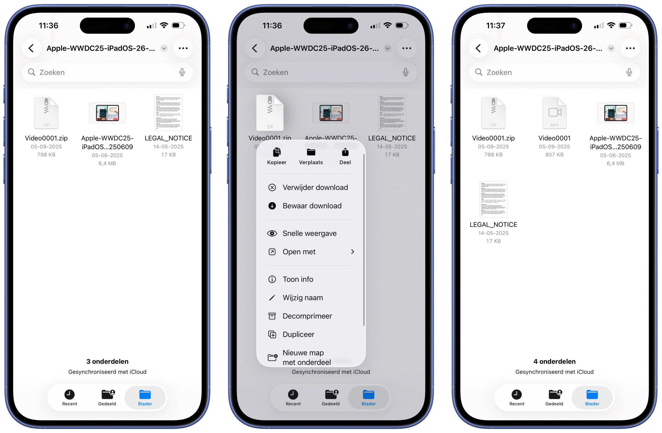 Vanuit de Bestanden-app en in iCloud Drive kun je gemakkelijker zipbestanden inpakken, uitpakken en bekijken. Door je vinger op een gezipt bestand te leggen kun je een map uitpakken met de optie Decomprimeer. Leg je op een bestand of map, dan kun je deze op dezelfde manier inpakken en vervolgens weer uitpakken. Bij het maken van een zipbestand blijft het origineel overigens ook bestaan.