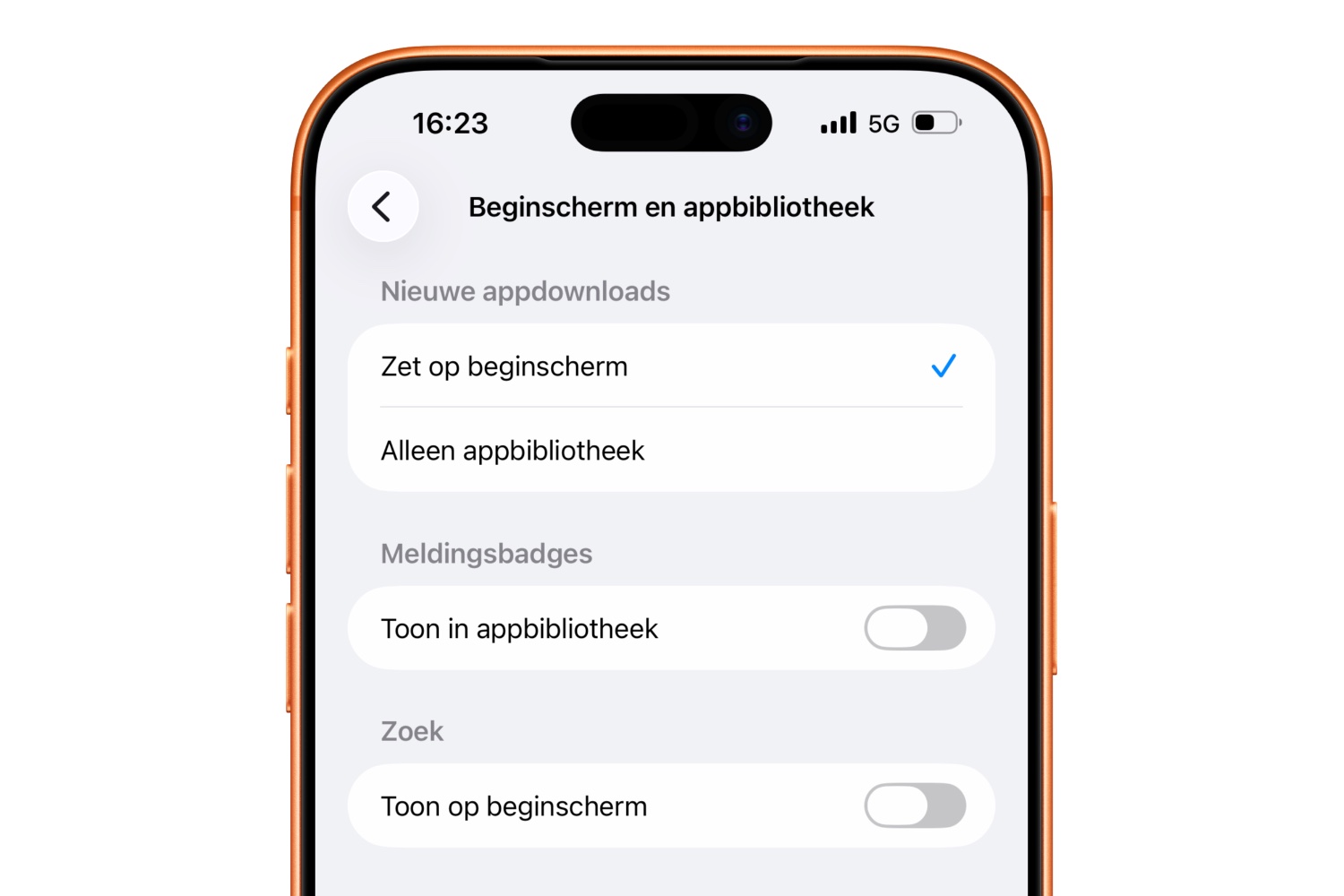 - Ga op de iPhone naar Instellingen > Beginscherm en appbibliotheek .