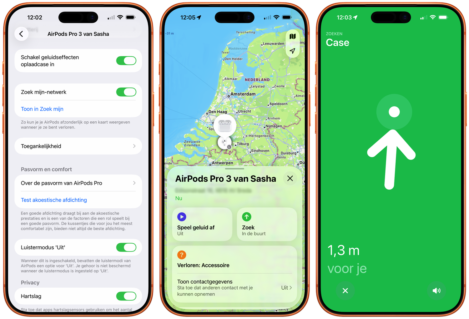 Zijn je AirPods niet verbonden, dan ga je meteen naar de Zoek mijn-app en tik je in het tabblad Apparaten op jouw AirPods. Tik op Zoek om er naartoe te navigeren. Loop wat rond en volg de instructies op het scherm. Je ziet de geschatte afstand en naarmate je dichterbij komt voel je tikjes en hoorbare aanwijzingen dat je in de buurt bent. Het is mogelijk dat de AirPods op een andere verdieping liggen. Ben je voldoende dichtbij dan kun je met Speel geluid af een geluidje afspelen. Dit werkt op de AirPods Pro 2022 nog beter, aangezien er een speaker in zit. Ook kan je AirPods Pro 3 in combinatie met een iPhone 15 of nieuwer (exclusief iPhone 16e) in een gebied tot 1,5x groter als voorheen nauwkeurig zoeken.