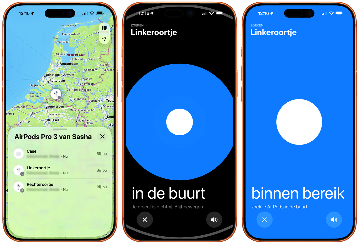 Bij de overige AirPods is het terugvinden afhankelijk van het model. Heb je de eerste of tweede generatie AirPods, dan kun je alleen de locatie zien waar deze voor het laatst verbonden waren met je iPhone. Je kunt ook een geluid afspelen mits ze verbonden zijn. Heb je AirPods 3 of nieuwer, AirPods Pro (1e generatie) of AirPods Max, dan zie je een globale locatie en kun je ze zoeken met een blauw scherm met witte stip, die groter wordt naarmate je dichterbij komt. Bij nieuwere modellen (zie hierboven) krijg je met een pijl een duidelijke richting aangegeven, inclusief de afstand in decimeters.