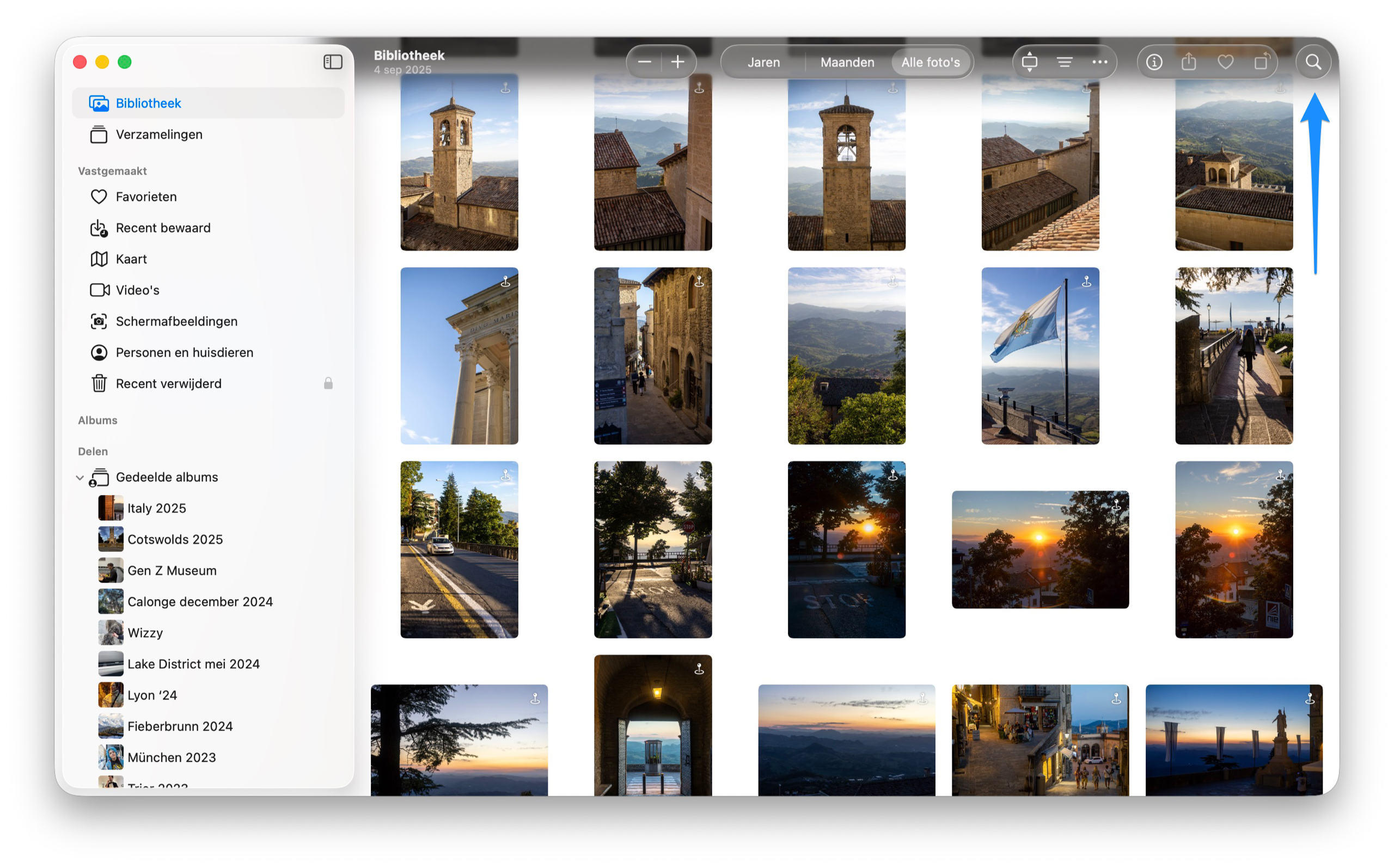 In het zoekveld kun je allerlei zoekopdrachten invoeren, zoals een locatie, datum, specifieke plaats of periode. Maar ook de naam van een persoon of trefwoorden zoals 2025, Rotterdam, bergen, bossen, auto, dieren, apen, bloemen, gebouw, huizen, vissen, thuis, een jaar geleden, favorieten en meer. Er is geen lijst met trefwoorden die Apple hanteert, dus het is een beetje experimenteren met zoekbegrippen totdat je vindt wat je zoekt.